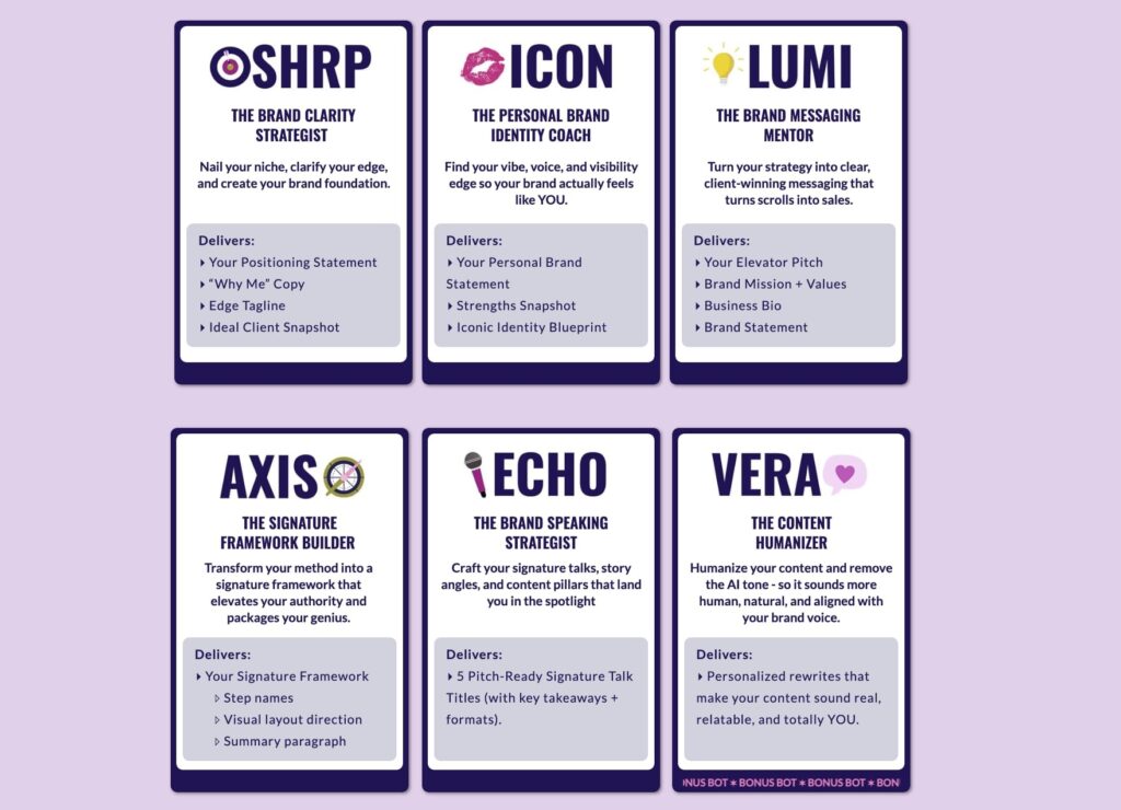 The Brand Force™ is made up of five AI brand assistants—each one trained with my proven brand strategy frameworks and designed to work together like a complete, on-demand brand team.